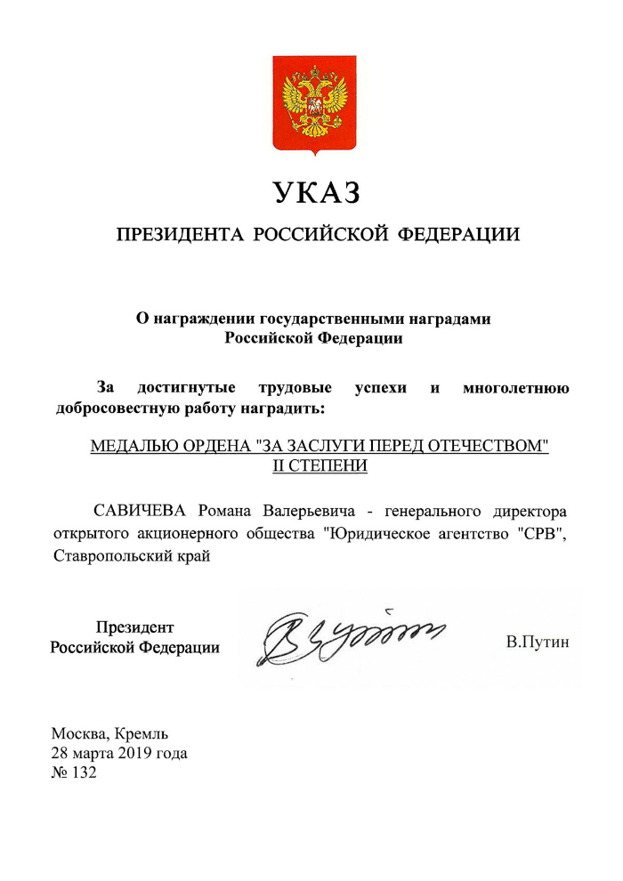Присвоение государственной награды РФ